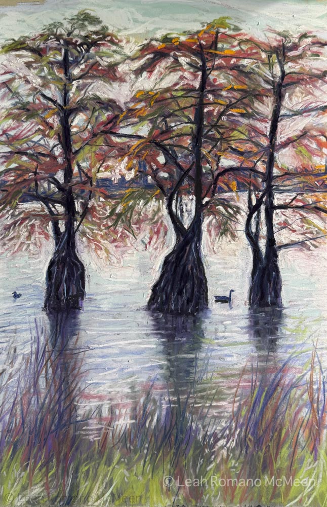 I created a soft pastel of the Three Sisters, a trio of bald cypress trees planted near Clear Lake in La Porte, Indiana. These special trees were said to be given as saplings at the 1893 Chicago World Fair, brought back to Indiana by a doctor. These amazing trees can live over 600 years! I then designed this painting into a WPA-style poster.